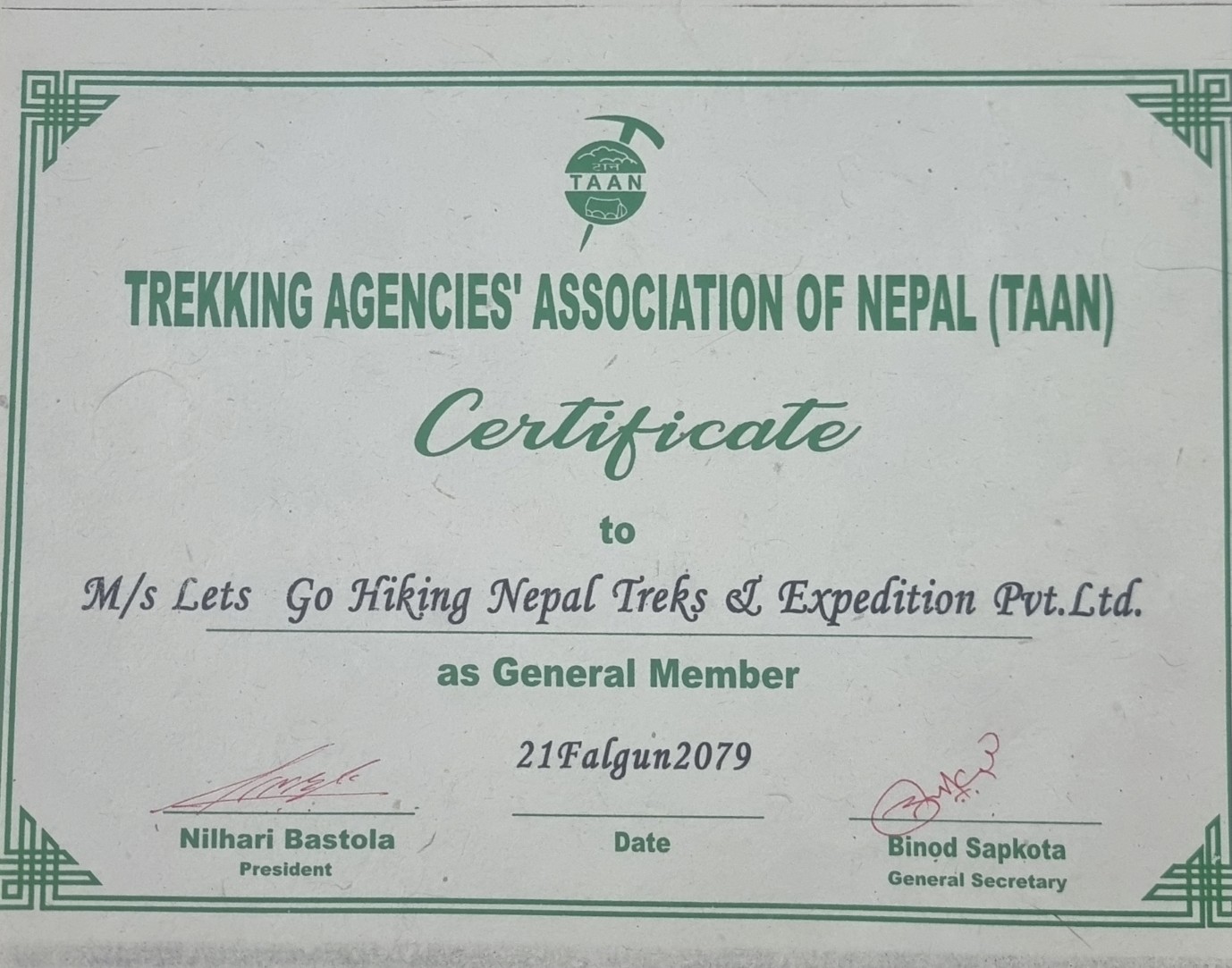 Trekking Agencis Association of Nepal (Taan) Certificate